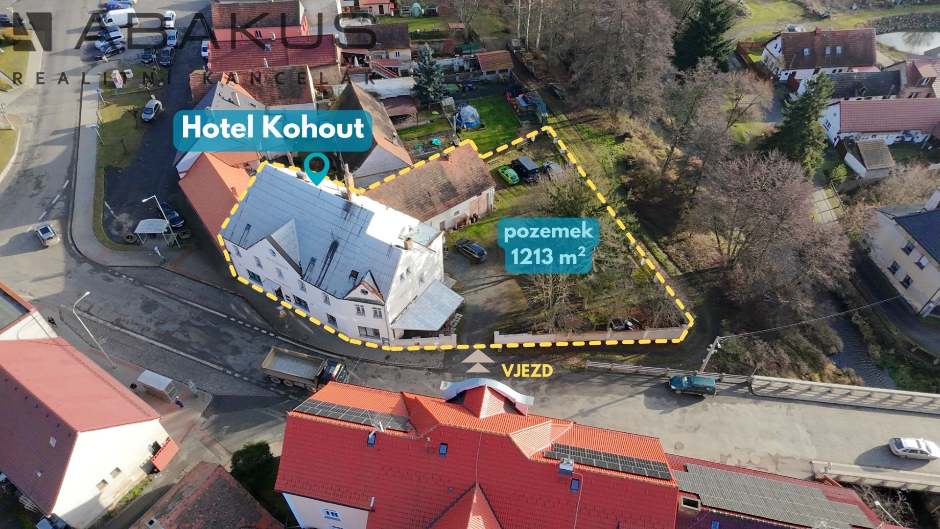 Celková výměra pozemku činí 1 213 m², vjezd přímo z veřejné komunikace.